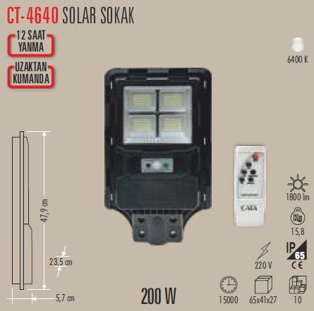 CATA CT-4640 200 WATT SOLAR SOKAK ARMATÜRÜ