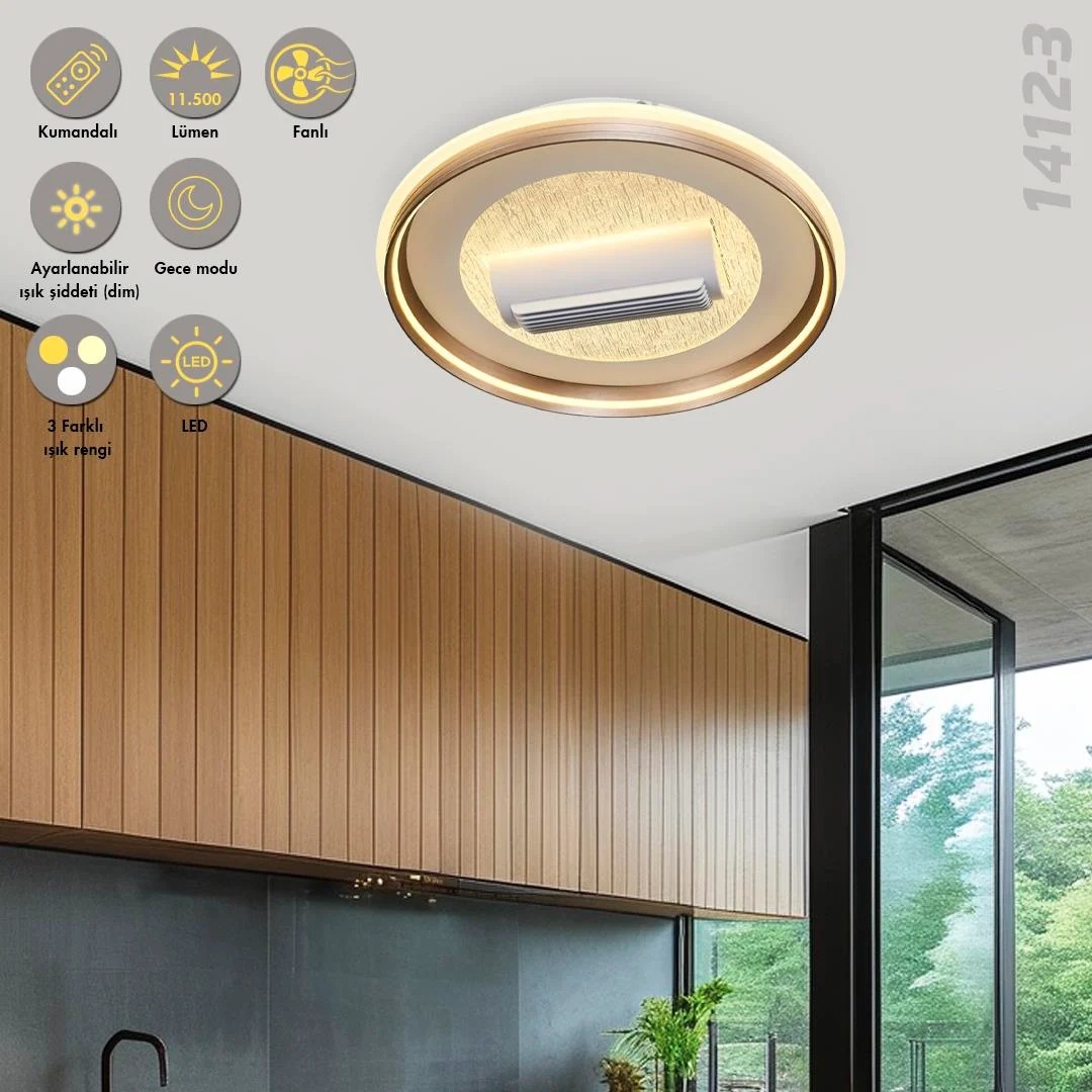 1412-3 Storm 60cm Fanlı Armatür (Kumandalı)Beyaz Renktedir. Metal gövde/Akrilik Materyale Sahiptir. 115 Watt LED Gücündedir. 11500 Lumendir. 3000 Kelvin Sarı Işık - 4000k Ilık Beyaz Işık - 6500k Beyaz Işık rengi tercihi yapabilirsiniz. Işık rengi azalıp çoğalabilir şekilde kontrol edebilirsiniz (dimmable). Gece modu özelliği mevcuttur. Üründe Fan özelliği ve 6 kademe fan hızı mevcuttur. Ürün Çapı:60 Ürün Yüksekliği:13 Fiziki Ölçülerindedir. 6.78 Kilogram Ağırlındadır. Tüm Materyaller Birinci Sınıftır. Ürünlerimiz Kullanıma Hazır Ve Montajlı Olarak Kutudan Çıkmaktadır. Ürünlerimizin Tamamı Yerli Üretimdir. Ürünlerimizi Evinizde Cafe Ve Restoranlarda Kullanabilirsiniz. Kutudan Çıkarılan Üründeki Tüm Koruma Ambalajlarını Çıkarmayı Unutmayınız. Doğaya Zarar Verecek Hiçbir Malzeme Kullanılmamıştır. Tüm Ürünlerimizde Led Ampul Kullanmanızı Öneriyoruz. Tüm Montaj Aparatları Koli İçinde Mevcuttur. Kullanım Kılavuzunu Önce Okumalısınız. Tüm Ürünlerimiz 220V Elektrik İle Çalışmaktadır. Ürünlerimizin Tamamında Deklarasyon Beyanı Bulunmaktadır. Iso / Ce / Lvd Sertifikaları Mevcuttur.